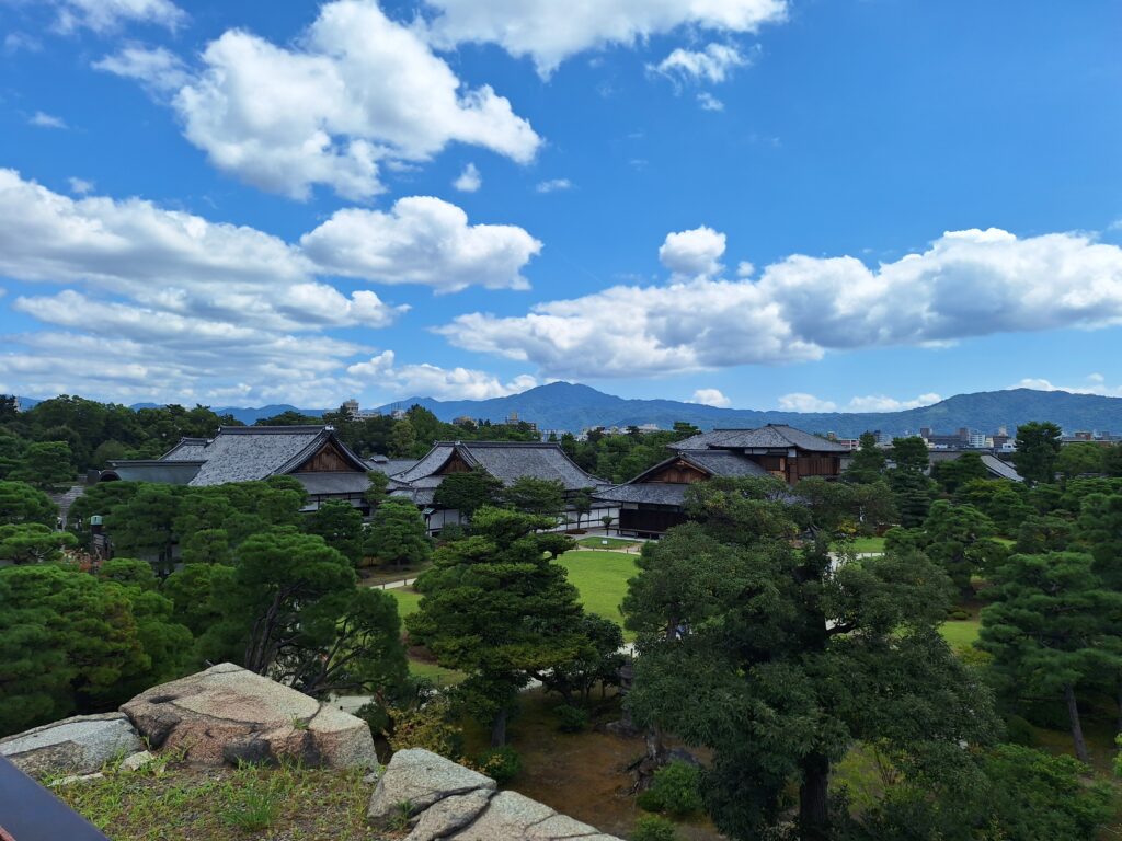 Boven op een van de torens kon je het hele kasteel nog zien, en is extra mooi met de bergen rondom Kyoto op de achtergrond!
